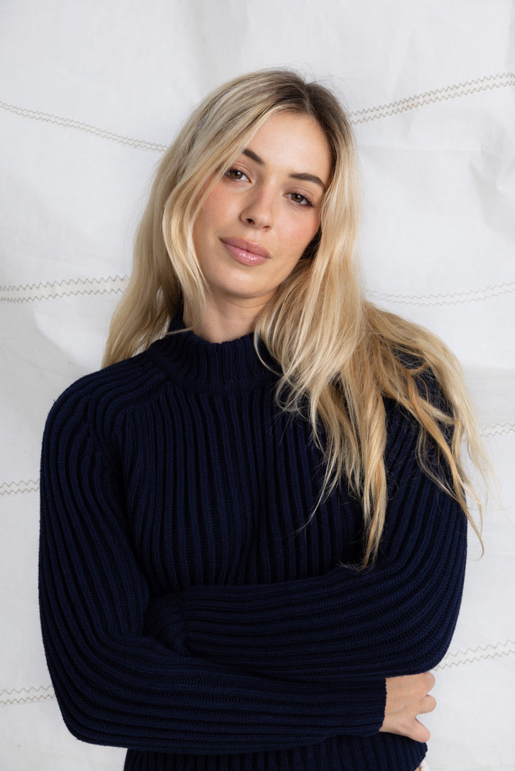 Le Pull HOMMAGE est identifiable par ses côtes double-face et ses manches raglans.